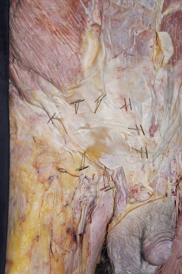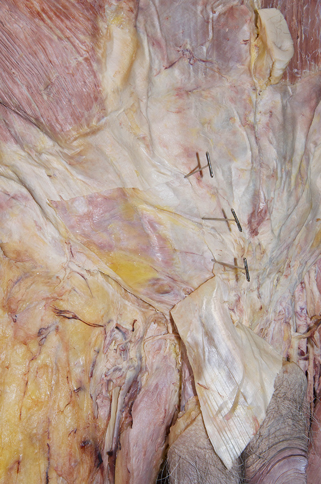 Dissect and identify the deep layers of the anterior abdominal wall on the right side of the cadaver. Before proceeding, carefully read step 7 and study the incision lines in the accompanying photograph for reflecting the aponeurosis of the external oblique muscle adjacent to the superficial inguinal ring.