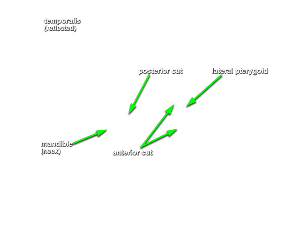 - (ON THE RIGHT SIDE ONLY) Cut the lateral pterygoid muscle approximately 1 cm from both its anterior and posterior attachments. Remove the muscle between the two cuts avoiding the long buccal nerve. Leave the mandibular head and articular disc in place.